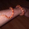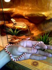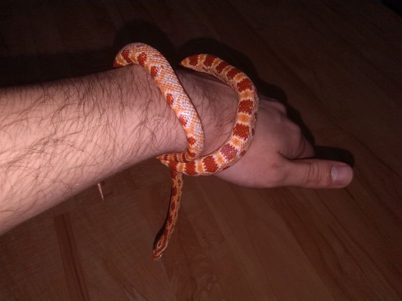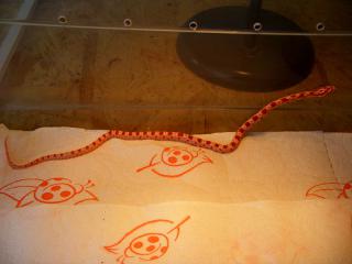 Z wężem nie miałem większych problemów, trochę czasu minęło zanim zjadł pierwszego mysiego osseska, ale później już jadał regularnie ( 2 razy w tygodniu). Obecnie je 1 mniejszą mysz na tydzień. Jak do tej pory nie zdarzyło się, abym został przez nią pogryziony (patrząc na ogon w miejscu kloaki, z jego kształtu wynika że jest to samica) obchodzę się z nią delikatnie, więc nie ma czemu mnie gryźć