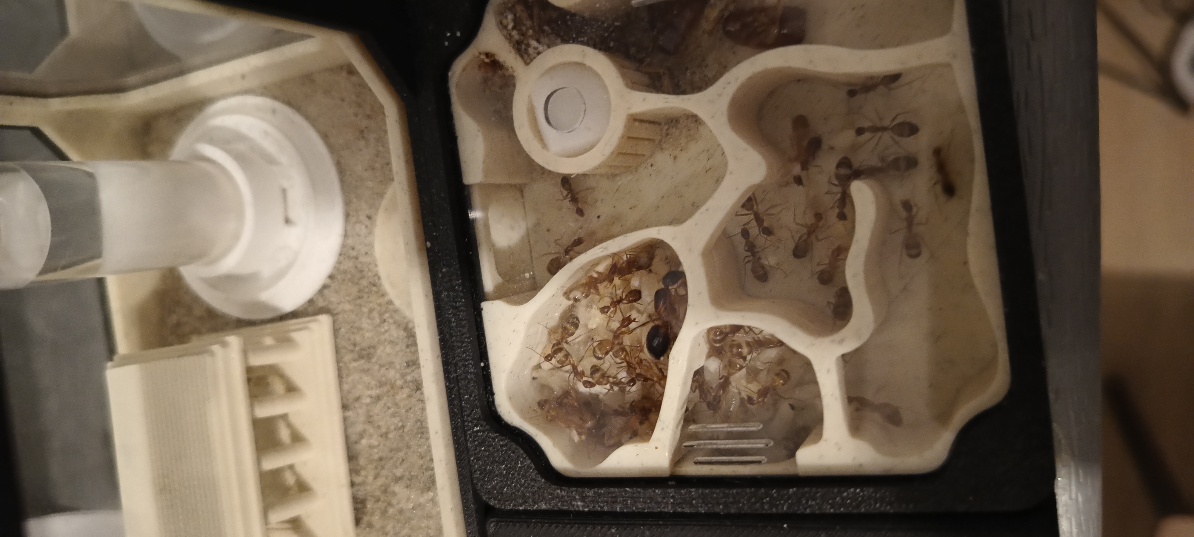 Od paru dni to pytanie jest poważniejsze ponieważ parę dni temu zauważyłem robotnice chodzącą po arenie z larwą, a dziś przy kontroli kolonii okazało się, że robotnice zniosły trochę jaj jak i larw pod zadaszoną ozdobę areny, kiedy podszedłem do terrarium mrówki uciekły z powrotem do gniazda wraz z larwami.
