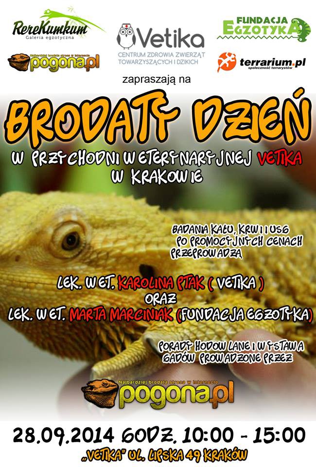 Pogona.pl wraz z Fundacją Egzotyka oraz Doktor Ptak (http://www.vetika.com.pl/) serdecznie zapraszają na Brodaty Dzień w przychodni weterynaryjnej Vetika w Krakowie przy ul. Lipskiej 49.