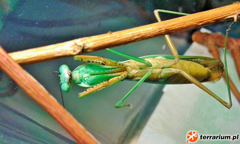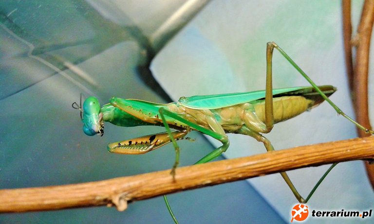 Gdy ją otrzymałem była mała, słaba, nie chciała jeść, miała nieciekawe ubarwienie. Zaskoczyła mnie jednak, nie poddawała się, i z każdą wylinką stawała się silniejsza i ciekawsza. Dziś jest najpiękniejszą modliszką jaką dotąd dochowałem do dorosłości - jej niepowtarzalne niebiesko-zielone ubarwienie i wielkie pomarańczowo-czarne skrzydła zachwycą każdego...a zresztą, sami się przekonajcie! ;D
