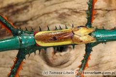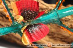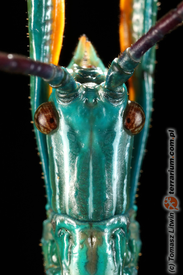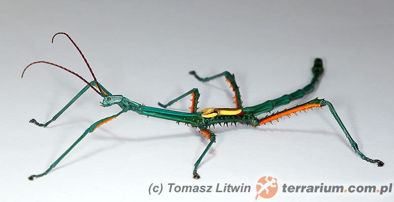 Achrioptera fallax to niezwykły gatunek patyczaka endemiczny dla Madagaskaru, należący do rodziny Phasmatidae. Owad ten osiąga imponujące rozmiary, przy czym samice są znacznie większe i masywniejsze od samców. Ciało jest wydłużone, cylindryczne, doskonale imitujące suchą gałązkę, co stanowi jego główną strategię obronną (mimetyzm). Samce charakteryzują się żywym, niebieskim lub zielonkawo-niebieskim ubarwieniem, podczas gdy samice są przeważnie brązowe lub szare. Gatunek ten jest ściśle związany z wilgotnymi lasami deszczowymi, gdzie bytuje w koronach drzew i w gęstym listowiu krzewów. Aktywny głównie nocą, żywi się liśćmi specyficznych roślin żywicielskich. Jego cykl życiowy obejmuje składanie jaj (owipozycję) do gleby, a młode są miniaturowymi wersjami dorosłych, przechodząc szereg wylinek....