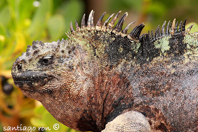 Amblyrhynchus cristatus to endemiczny gatunek legwana występujący wyłącznie na Wyspach Galapagos. Jako jedyna współczesna jaszczurka prowadzi morski tryb życia, doskonale przystosowana do życia w środowisku przybrzeżnym. Charakteryzuje się ciemnym, szaro-czarnym ubarwieniem ciała, grzebieniem kolczastych łusek ciągnącym się od głowy przez grzbiet aż do ogona oraz silnymi kończynami z pazurami umożliwiającymi przyczepianie się do skał. Żywi się niemal wyłącznie glonami morskimi, które zjada podczas zanurzeń w zimnych wodach Oceanu Spokojnego. Aby regulować temperaturę ciała po pobycie w wodzie, wygrzewa się masowo na czarnych skałach wulkanicznych. Gatunek ten żyje w dużych, zhierarchizowanych koloniach. Samce są terytorialne i agresywnie bronią swoich rewirów. Posiada specjalne gruczoły nosowe, które pozwalają mu filtrować i wydalać nadmiar soli z organizmu....