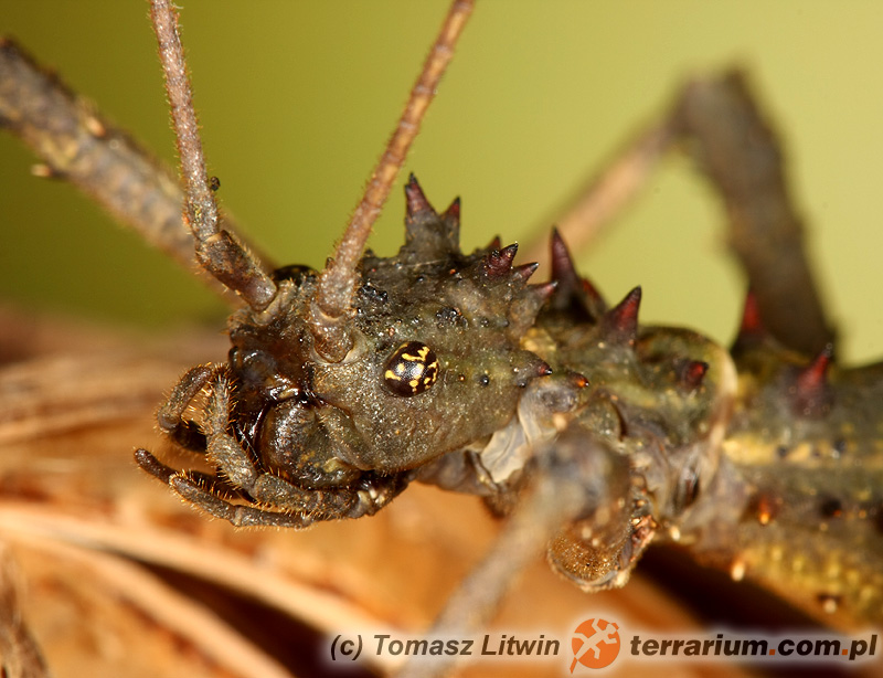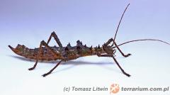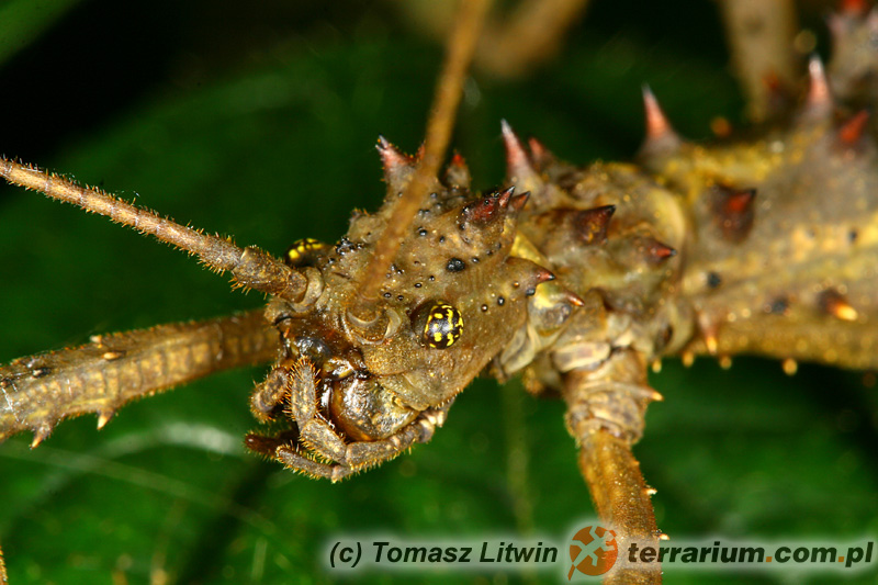 Aretaon asperrimus, znany jako straszyk rogaty, to fascynujący owad z rzędu straszyków, endemiczny dla wyspy Borneo. Jego ciało, osiągające 6-8 cm długości, pokryte jest licznymi, ostrymi wyrostkami i kolcami, które doskonale imitują suchy, martwy liść lub fragment kory, zapewniając mu znakomity kamuflaż. Występuje w wilgotnych, tropikalnych lasach deszczowych, gdzie prowadzi nocny tryb życia, pozostając w bezruchu w ciągu dnia. Żywi się głównie liśćmi jeżyn, malin, dębu i innych roślin. Gatunek jest partenogenetyczny, co oznacza, że samice mogą rozmnażać się bez udziału samców, składając jaja (owoskład), z których wylęgają się ich klony. W sytuacji zagrożenia potrafi odrzucić kończynę, która z czasem się regeneruje (autotomia). Jest to gatunek jajorodny, a jego hodowla w terrarium jest stosunkowo prosta, wymaga jednak wysokiej wilgotności powietrza....