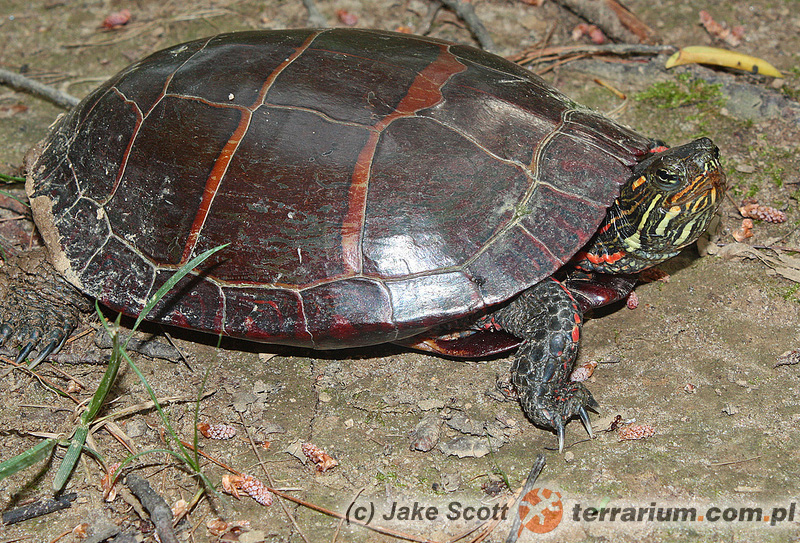 Chrysemys picta, czyli żółw malowany, to jeden z najpopularniejszych i najbarwniejszych żółwi słodkowodnych Ameryki Północnej. Jego karapaks jest gładki, oliwkowozielony z jaskrawoczerwonymi i żółtymi wzorami na marginesach. Skóra głowy, szyi i kończyn jest w ciemne paski na żółtawym lub zielonym tle. Jest doskonałym p...