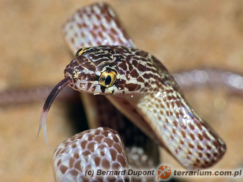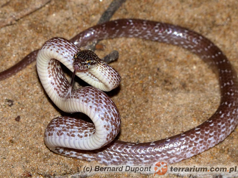 Mały wąż o smukłej budowie ciała. Wielkość od 65 do 80. Oczy duże z pionowymi źrenicami. Głowa szeroka płaska wyodrębniona wąską szyją od reszty ciała. Na głowie dominuje barwa jasna,... czytaj więcej zaloguj się lub zarejestruj się |