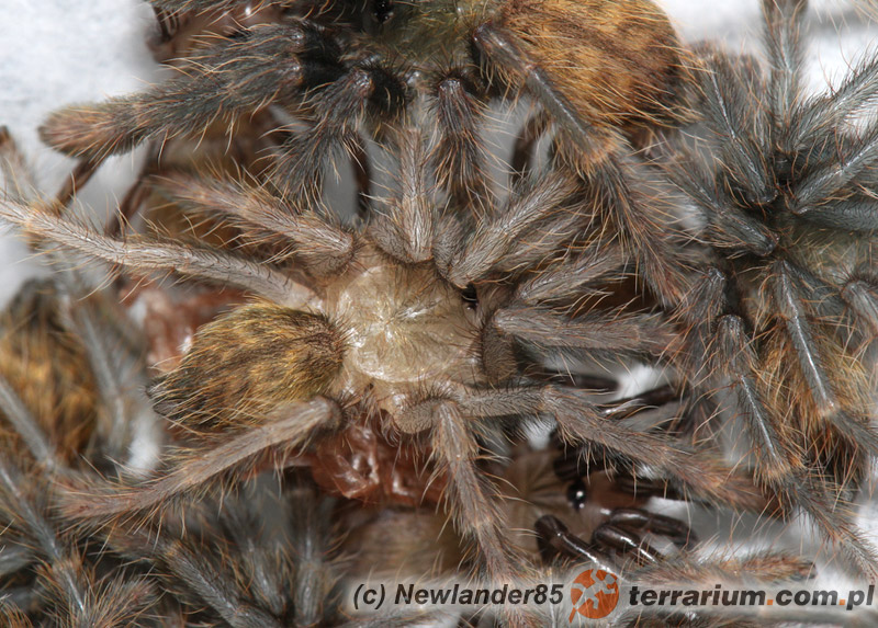 Samica składa kokon między drugim a trzecim miesiącem po udanej kopulacji. W kokonie znajduję się 30-70 jaj, po około 60 dniach inkubacji w kokonie znajdziemy pająki w stadium L1.