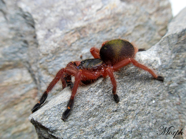 Młode osobniki są bardzo kolorowe: tarczka grzbietowa jest czarna z zielonkawym połyskiem, odwłok opalizuje na zielono, kądziołki przędne są różowe. Nasada kłów jadowych metalicznie niebie... czytaj więcej zaloguj się lub zarejestruj się