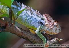 Furcifer verrucosus, znany jako kameleon brodawkowaty lub kameleon pustynny, to gatunek jaszczurki z rodziny kameleonowatych, endemiczny dla suchych i półsuchych regionów Madagaskaru, w tym obszarów zachodnich i południowych. Osiąga długość do 50 cm, przy czym samce są znacznie większe od samic i posiadają charakterystyczny, przypominający hełm, pojedynczy wyrostek na głowie oraz wysoką, ząbkowaną grzywę grzbietową. Ubarwienie jest zmienne, często w odcieniach szarości, brązu i zieleni, doskonale maskujące na tle skał i suchych zarośli. Gatunek ten jest jajorodny, a samica składa jaja w wilgotnej ziemi. Jego dieta składa się głównie z owadów, które chwyta za pomocą lepkiego, wyrzucanego z dużą prędkością języka. Jest gatunkiem dziennym, prowadzącym nadrzewny i naziemny tryb życia, przystosowanym do wysokich temperatur i niskiej wilgotności. Wykazuje typowe dla kameleonów zdolności do niezależnego poruszania oczami i zmiany koloru skóry, choć w mniej spektakularnym zakresie niż inne gat...