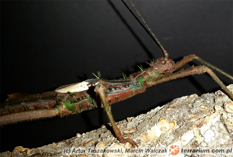 Gatunek może być hodowany w sterylnym terrarium o bardzo ograniczonym wyposażeniu, zredukowanym do warstw ręcznika papierowego jako podłoże, kilku gałęzi umożliwiających wspinanie się owado... czytaj więcej zaloguj się lub zarejestruj się