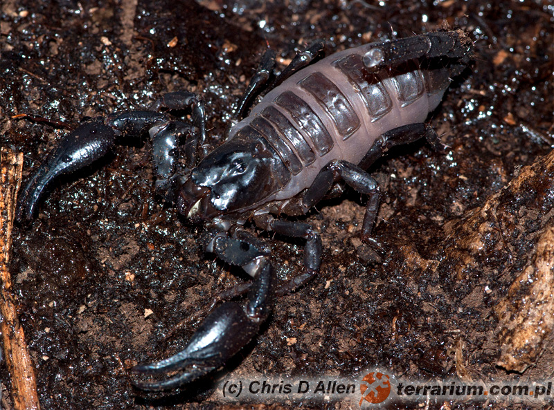 Heterometrus spinifer to duży skorpion z rodziny Scorpionidae, występujący w lasach tropikalnych Azji Południowo-Wschodniej, głównie w Tajlandii, Malezji i Indonezji. Osiąga imponujące rozmiary, dochodząc nawet do 15-20 cm długości. Jego ciało jest masywne, o jednolicie czarnym lub ciemnobrązowym ubarwieniu, z charakterystycznymi, potężnymi szczypcami (pedipalpami) i grubym, segmentowanym odwłokiem zakończonym kolcem jadowym (telson). Zamieszkuje wilgotne, zacienione środowiska, gdzie kopie głębokie nory lub kryje się pod kamieniami, butwiejącymi kłodami i opadłymi liśćmi. Jest gatunkiem nocnym; w ciągu dnia pozostaje w ukryciu. Poluje głównie na duże owady i inne stawonogi, które unieruchamia za pomocą szczypiec, a jad wykorzystuje jedynie w ostateczności. Jego tokyna jest stosunkowo słaba i porównywalna z użądleniem pszczoły. Jest zwierzęciem jajożyworodnym – samica rodzi żywe młode, które przez pewien czas nosi na grzbiecie. W hodowli ceniony jest za łagodne usposobienie i spektakul...