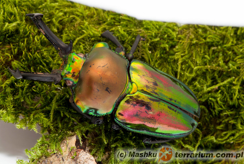 Phalacrognathus muelleri, znany jako tęczowy chrząszcz, to niezwykle kolorowy owad z rodziny poświętnikowatych, endemiczny dla północno-wschodniego Queenslandu w Australii. Osiąga długość od 20 do 30 mm i charakteryzuje się wyjątkowym, metalicznym ubarwieniem, które mieni się odcieniami zieleni, złota, czerwieni i fioletu w zależności od kąta padania światła. Jego ciało jest masywne, a samce posiadają imponujące, rozwidlone żuwaczki przypominające poroże, służące do walk godowych. Owad ten zamieszkuje wilgotne lasy deszczowe, gdzie jego larwy rozwijają się w spróchniałym drewnie drzew tropikalnych, takich jak Flindersia. Dorosłe osobniki są aktywne głównie nocą i żywią się sokami wyciekającymi z uszkodzonych drzew. Ze względu na spektakularny wygląd jest cenionym gatunkiem wśród kolekcjonerów, a jego hodowla w terrariach wymaga zapewnienia wysokiej wilgotności i odpowiedniego podłoża z butwiejącego drewna....