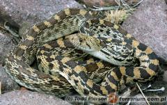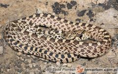 Pituophis catenifer, znany jako wąż byczy, to duży, niejądrowity wąż z rodziny połozowatych, występujący w Ameryce Północnej, od południowej Kanady po północny Meksyk. Osiąga imponujące rozmiary, od 1,2 do nawet 2,5 metra długości, charakteryzując się masywną, muskularną budową ciała. Jego ubarwienie jest zmienne, zazwyczaj w odcieniach żółci, brązu i kremu, z seriami ciemnych, prostokątnych plam na grzbiecie. Zamieszkuje zróżnicowane środowiska, w tym suche prerie, zarośla, lasy sosnowe, półpustynie i tereny rolnicze. Jest aktywny głównie za dnia. Jego dieta jest wyjątkowo zróżnicowana i obejmuje głównie małe ssaki (gryzonie, króliki), ptaki i ich jaja, które potrafi wydłubać z gniazd dzięki specjalnie przystosowanym wyrostkom na pysku. Wąż ten słynie z głośnego, donośnego syku, przypominającego porykiwanie byka, który służy do odstraszania drapieżników. Jest zwierzęciem jajorodnym, samica składa latem do 24 jaj. Pomimo groźnego zachowania obronnego, jest gatunkiem generalnie łagodnym...