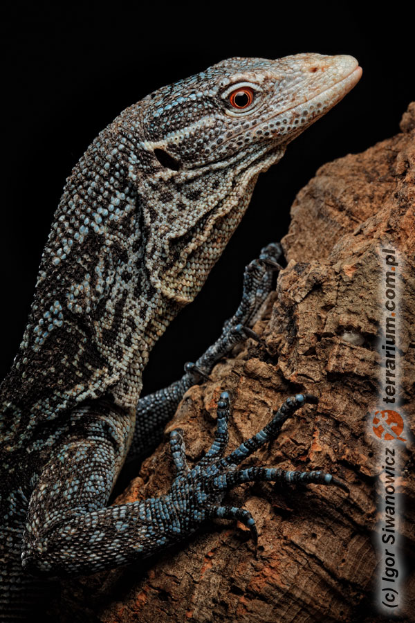 Varanus macraei to niezwykle rzadki i endemiczny gatunek jaszczurki z rodziny waranów, odkryty w 2001 roku na wyspie Batanta w archipelagu Raja Ampat w Indonezji. Jego najbardziej charakterystyczną cechą jest intensywnie niebieskie ubarwienie ciała z czarnymi, poprzecznymi pręgami i rozproszonymi niebieskimi łuskami. Głowa jest czarna z niebieskimi plamkami, a ogon niebieski z ciemnymi obrączkami. Jest to gatunek nadrzewny, zamieszkujący wilgotne lasy deszczowe, gdzie spędza większość życia w koronach drzew. Żywi się głównie owadami i innymi drobnymi stawonogami. Ze względu na bardzo ograniczony zasięg występowania i niszczenie jego naturalnego środowiska jest gatunkiem zagrożonym. W hodowli terrariowej wymaga wysokiego, gęsto urządzonego terrarium z dużą ilością gałęzi do wspinaczki....