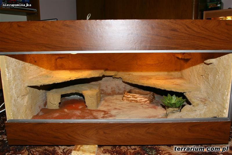 Z zewnątrz ładna "drewniana"okleina, szyby z białego szkła(nie zielonego jak w innych terrariach) wysuwane. Zamontowane 3 ceramiczne oprawki. Jest dziura na kabel grzewczy. Gratis kamienie, kaktus i miska.