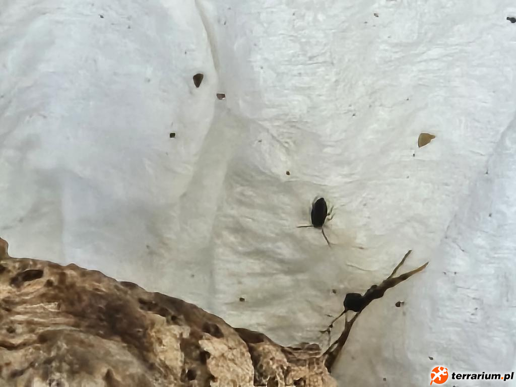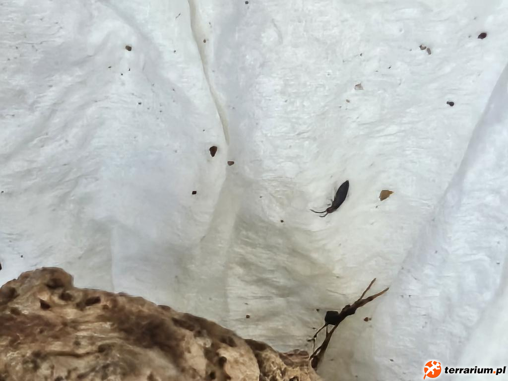 Witam, ostatnio w terrarium z gekonem orzęsionym pojawiły się małe czarne robaczki, mimo trzykrotnego mycia i wymiany podłoża one nadal się pojawiają, ostatnio wymieniłem płatki Kokosowe na ręcznik papierowy żeby lepiej zrobić zdjęcia, mają czułka i rozmiar około pół milimetra może mniej. Ktoś może zidentyfikować co to jest i jak się tego skutecznie pozbyć?