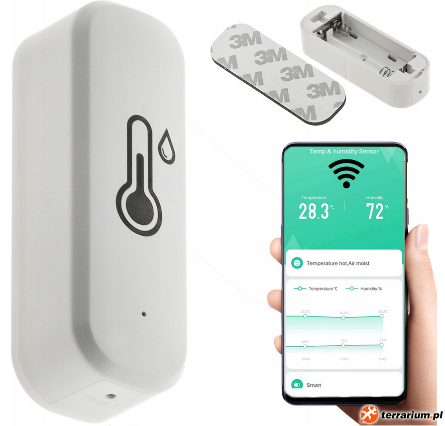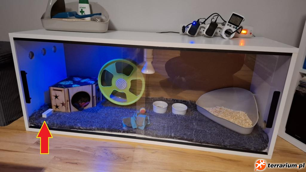 Dla lepszego zwizualizowania fotka terrarium z termometrem WiFi, zaznaczony strzałką.