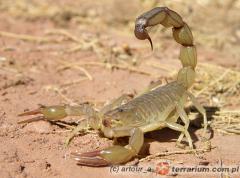 Jest dość ciekawie ubarwiony, mesosoma może przybierać kolor brązu lub ciemnej czerwieni. Żółtego koloru są nogi, pedipalpy i 3 pierwsze segmenty metasomy. Telson oraz 4 i 5 segment metasomy mogą być koloru czarnego lub ciemnobrązowego.