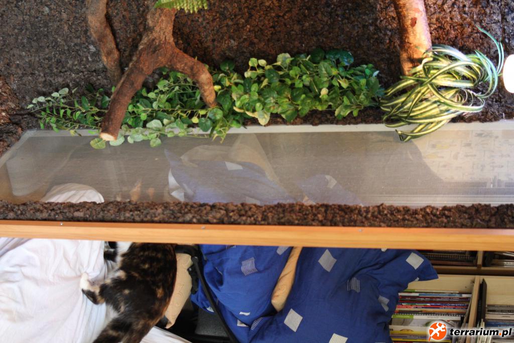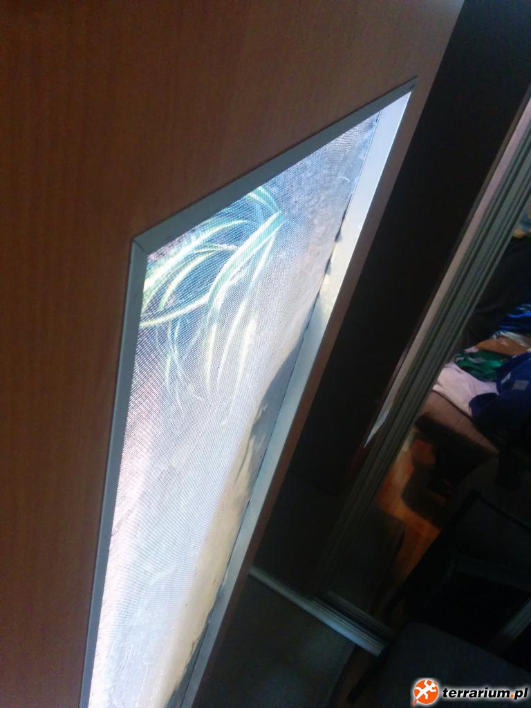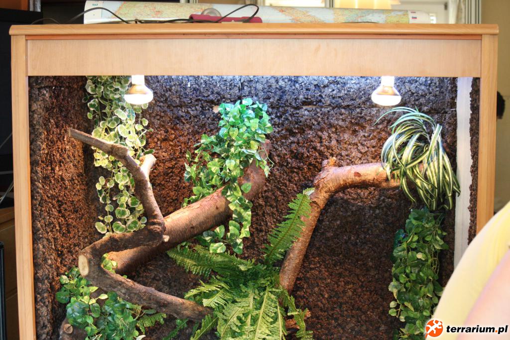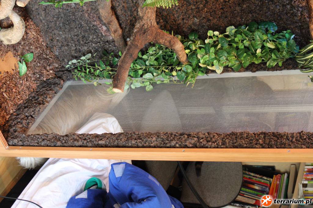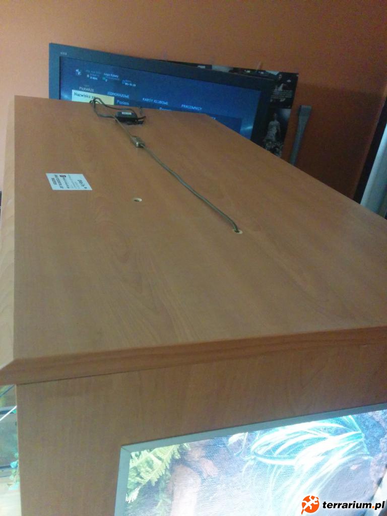 Witam, sprzedaje duże terrarium o wymiarach 178/119,5/60,5 wys/szer/gł. Terra posiada dwa miejsca na żarówki cieplne i jedno na UV 90cm.Oklejone jest korkiem odpornym na wilgoć i pleśń. Wentylacja, na dole od frontu i cała ścianka boczna terra, dzięki czemu w terrarium jest zawsze dużo tlenu. Z tyłu terrarium jest dykta która jest pęknięta (widoczne na zdjęciach poniżej) ale to nie przeszkadza ponieważ ścianka jest stabilna a korek sprawia że jest sztywna. Spokojnie utrzymywała legwana zielonego ![]()