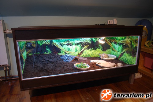 Dziękuję za wszelką pomoc. Dziś mam nowe terrarium i urządziłam je tak, że na dno dałam bardzo grubą folię budowlaną przyklejoną do ścianek mocną taśmą srebrną - w Casto mi ja polecili jako szczególnie odporną. Boki to plastikowa chyba fototapeta - wybór poprzedniego właściciela terrarium. Do tego świetlówka UVB na całość terrarium, i żarówka grzewcza - daje tyle co trzeba. Zamontowałam termometry i czujniki i strefy temperatury są ok. Wymiary to 133 na 66 na 50. Nie mam kryjówki, ale Kowalski jest dużym żółwiem i nie wiem skąd taka dużą, poza tym, może odkryje swój talent do zakopywania - ma w najwyższym miejscu około 25 cm ziemi. Pomieszałam ją z gliną wędkarską ale te 3 paczki gliny zanikły w 80ciu litrach ziemi.... Muszę to wyrównać jakoś bo żółw chodzi utytłany z ziemi