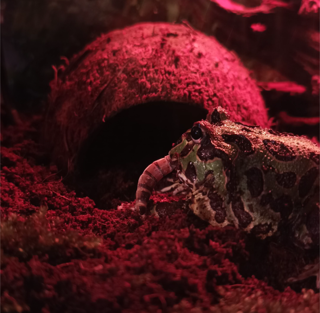 Wybór padł na żabę rogatą- prosta, żarłoczna, nie wymaga zbyt wiele (niby tak ale o wymaganiach za chwilę), nie można trzymać w grupie, dostępność pokarmu - same plusy (o ile nie przeszkadza to, że zwierzę znika po nakarmieniu!)