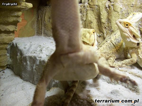 Otóż moja samiczka atakuję samca. Może nie byłoby to dla mnie specjalnie dziwne jeśli robiłaby to z agresją, lub była rozdrażniona. Ona po prostu chce zjeść jego nogę! Patrzy na jego nogę jak na jedzenie i łapie tak samo jak owady karmowe. Martwi mnie ta sprawa bo samiec ma już pokaleczone dwie łapki. Jedzenia mają pod dostatkiem więc proszę nie pisać, że głodzona